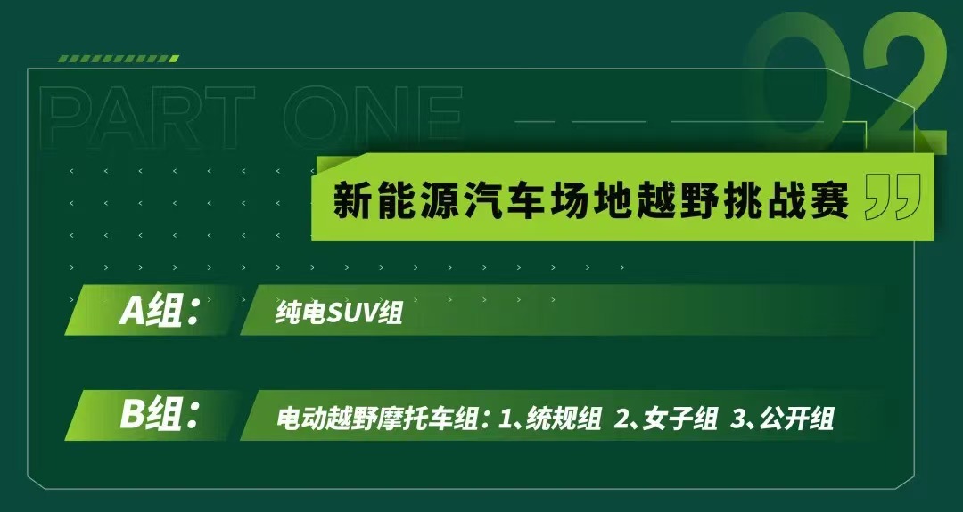 3. 比赛组别:分为A组(纯电SUV组)和B组(电动越野摩托车组,1. 统规组;2.女子组;3.公开组)。汽车纯电SUV组接受30辆车(60人)报名参赛,参赛车辆必须已进入《新能源汽车推广应用推荐车型目录》(至报名时间止);电动越野摩托车组名额暂不限制,该组别需自带车。